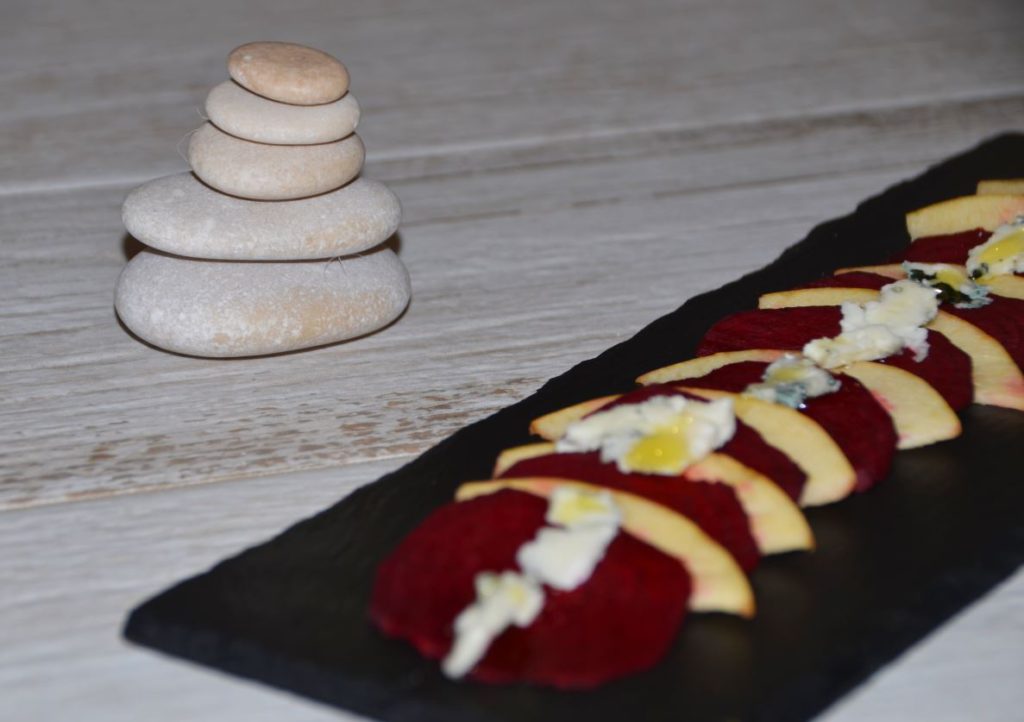 Cortar los dos en cortes muy delgados y organícelos alternativamente en un plato.
