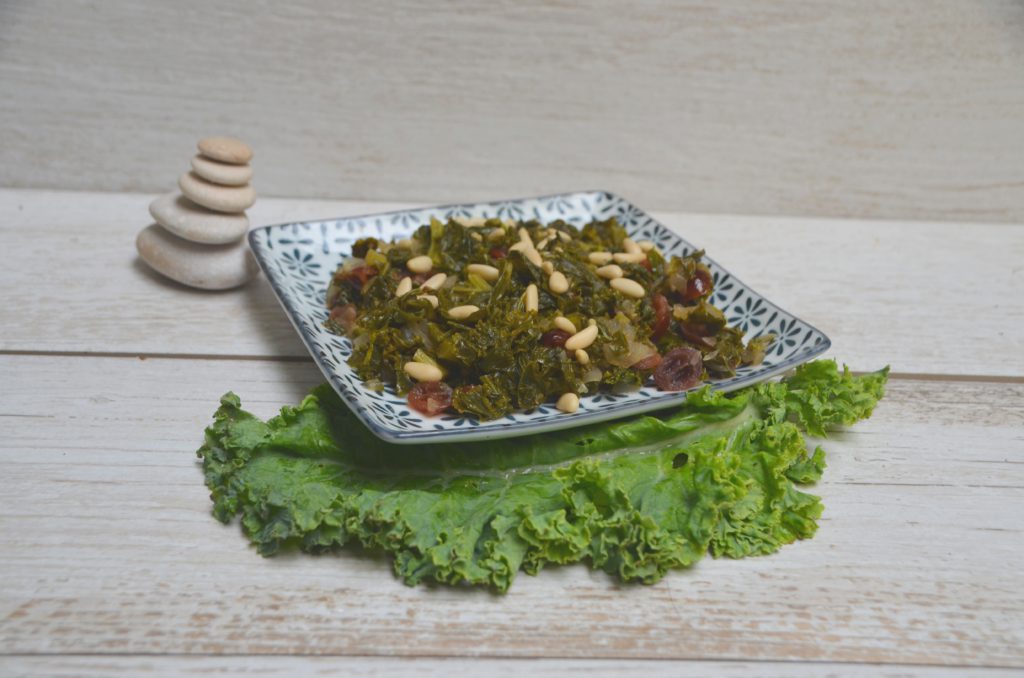 Añadir las coles y mezclar. Añadir las pasas y el caldo y dejar cocer unos 7/10 Minutos hasta que la col esté tierna. Salmimentar otra vez y añadir los piñones al final.